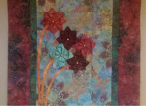 Greetings art gang! I have been playing with fabric origami. Remember that our next class at Quilter’s